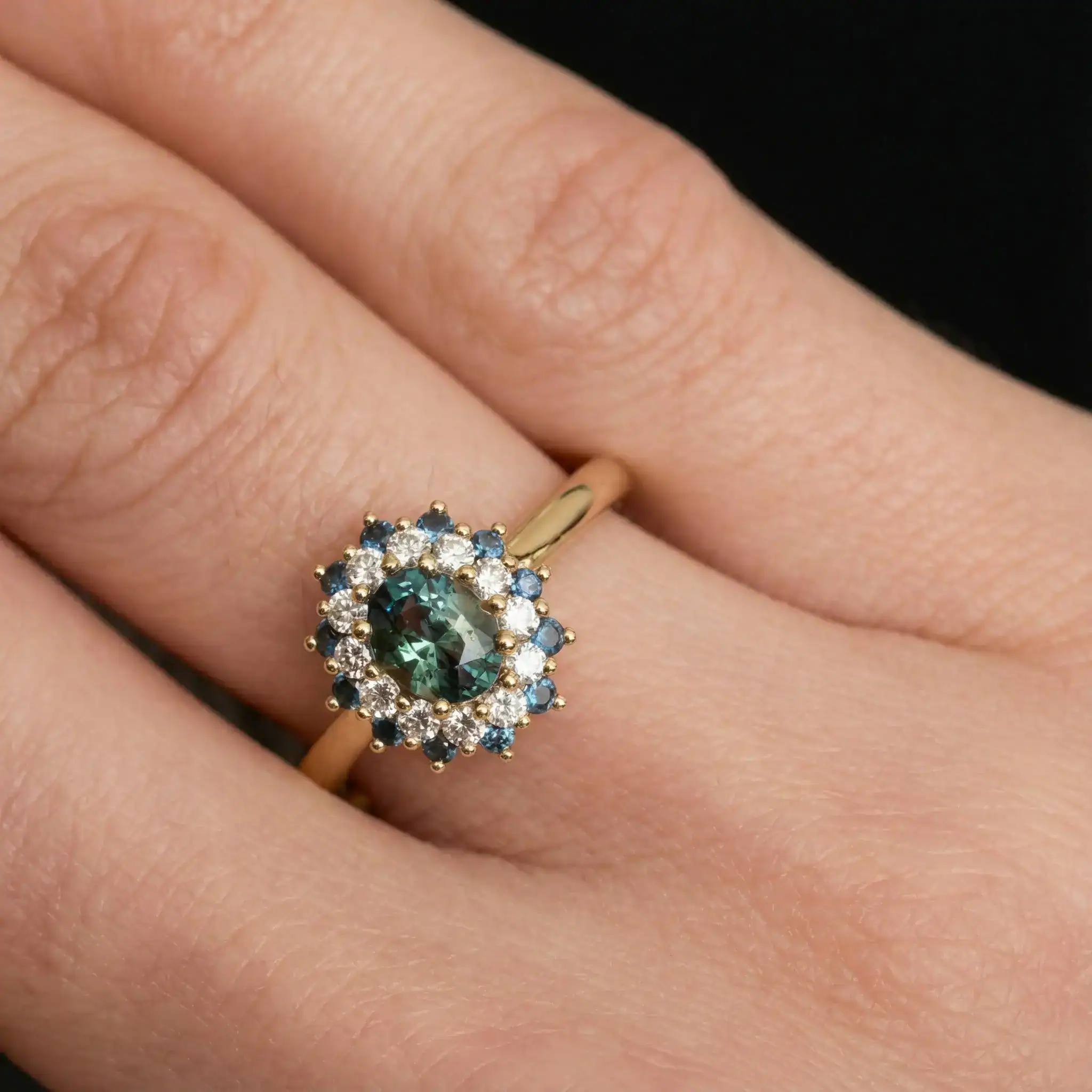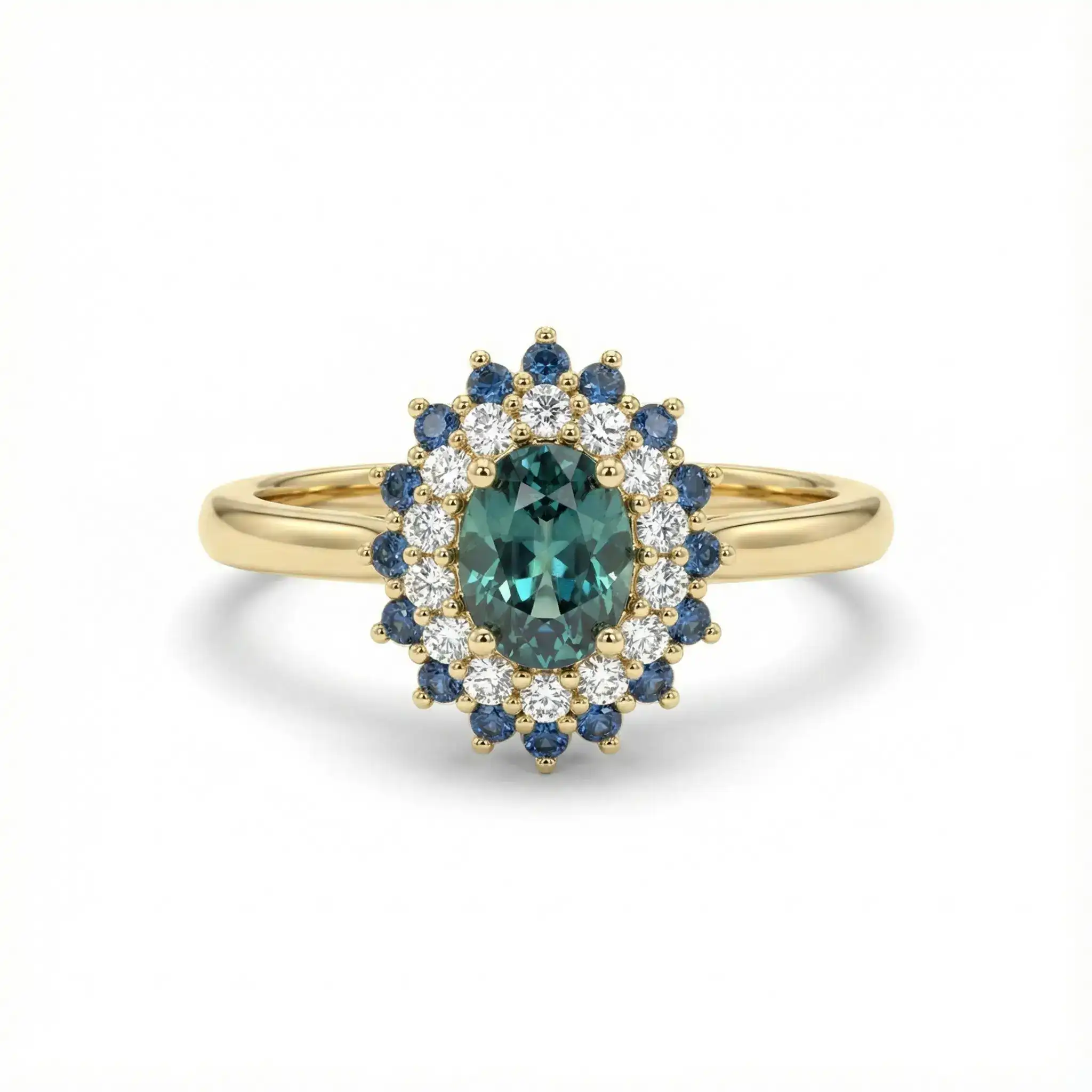 טבעת זהב יוקרתית ומרשימה, משובצת אבן מרכזית בחיתוך אובל, מוקפת בשתי שורות של אבנים נוצצות בגווני לבן וכחול, בעיצוב הילה כפולה בסגנון דיאנה האייקוני. השילוב בין האבנים הלבנות לכחולות יוצר עומק, ניגודיות ואלגנטיות על-זמנית, עם נוכחות יוקרתית ומלאת אופי.