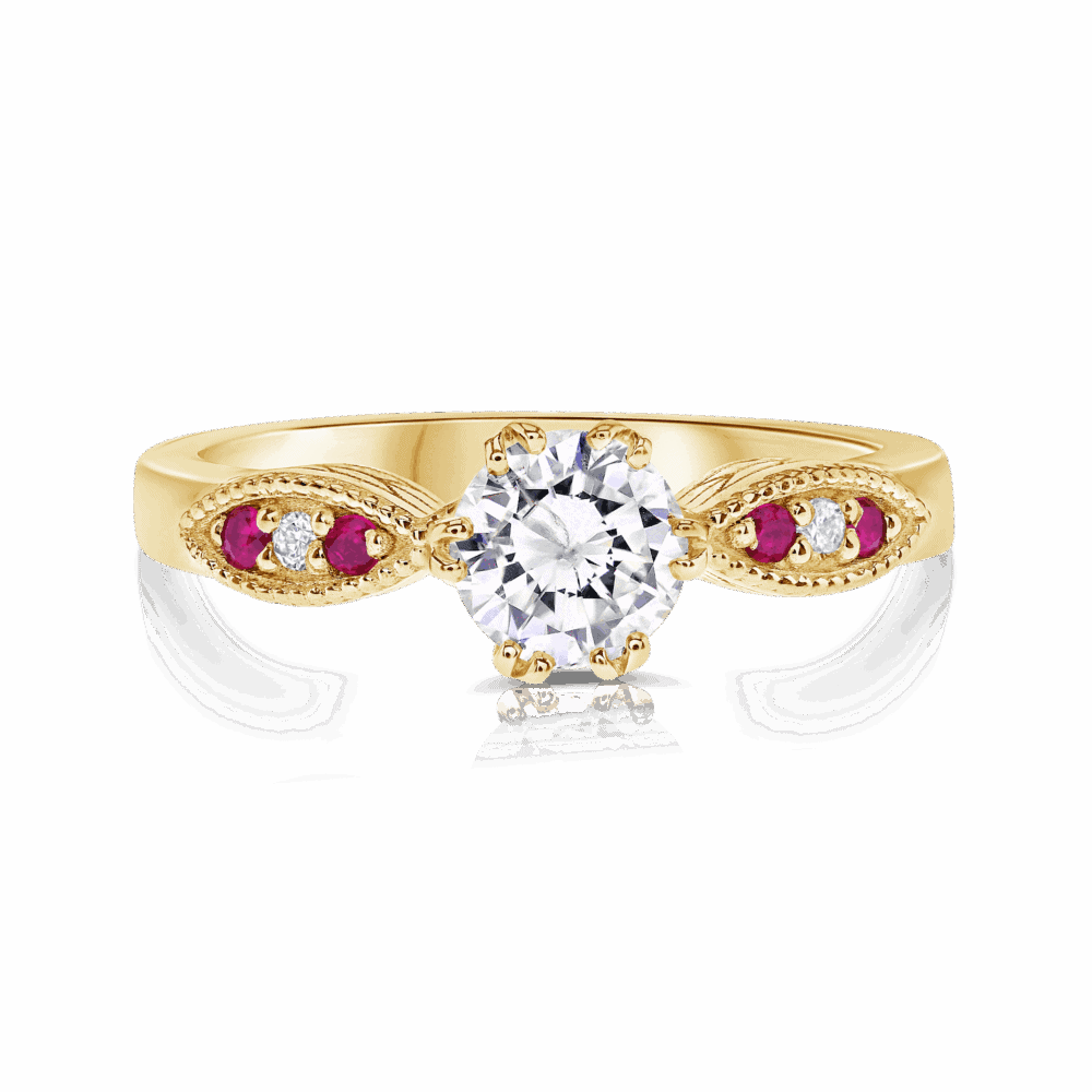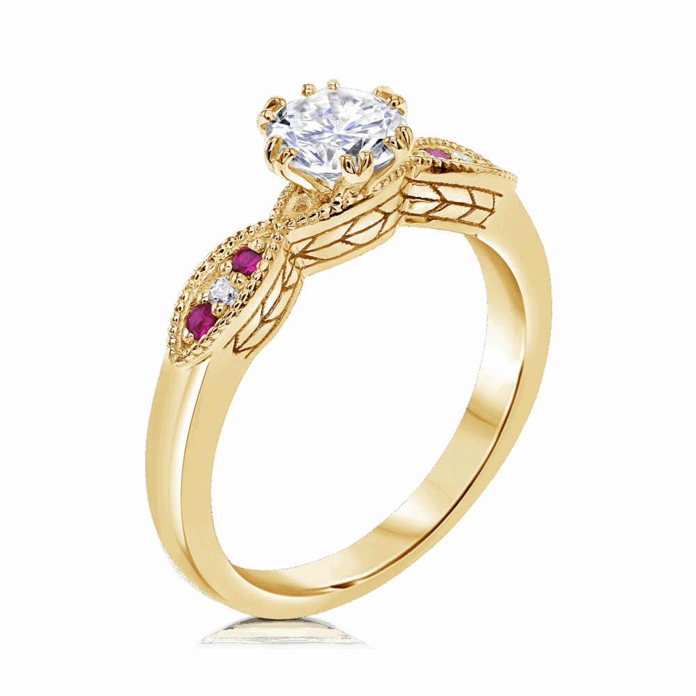טבעת אירוסין וינטאג' זהב 14K לבן צהוב או ורוד. משובצת יהלום מרכזי 0.40 נקודות. ואבני חן רובי בצד.