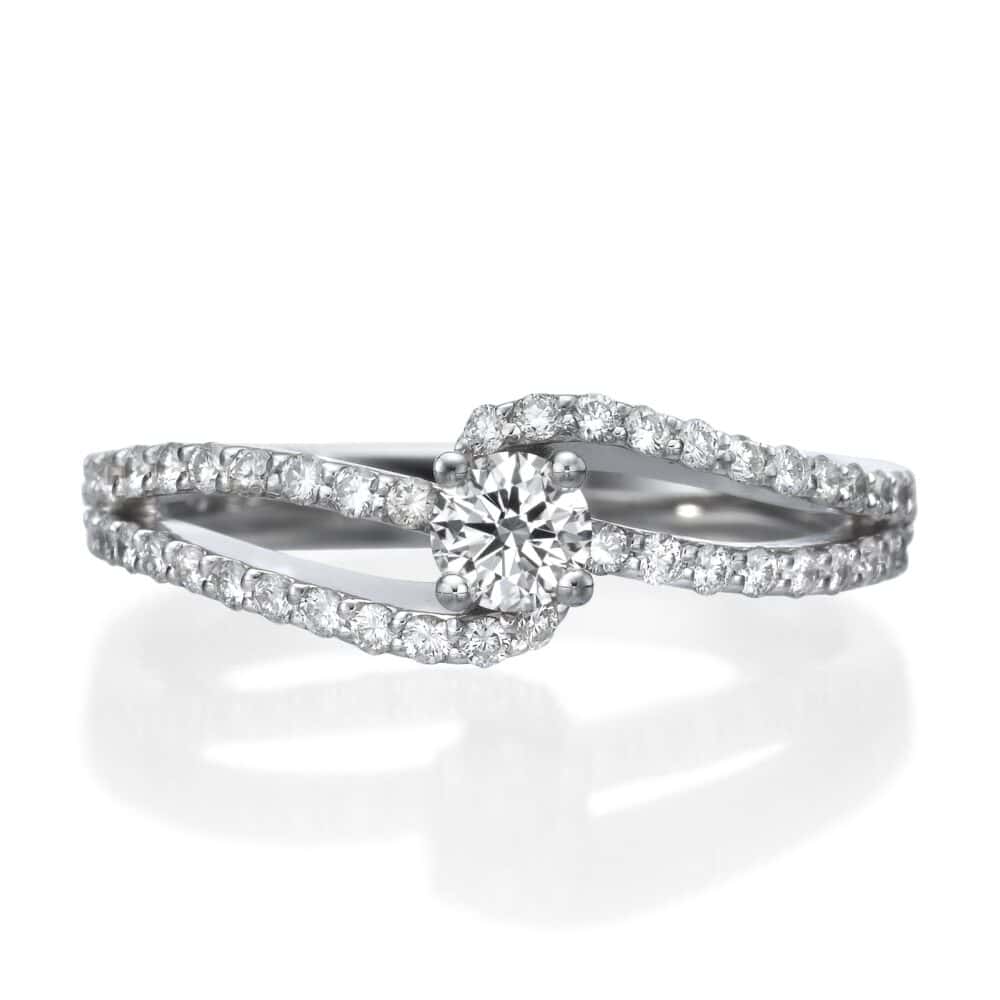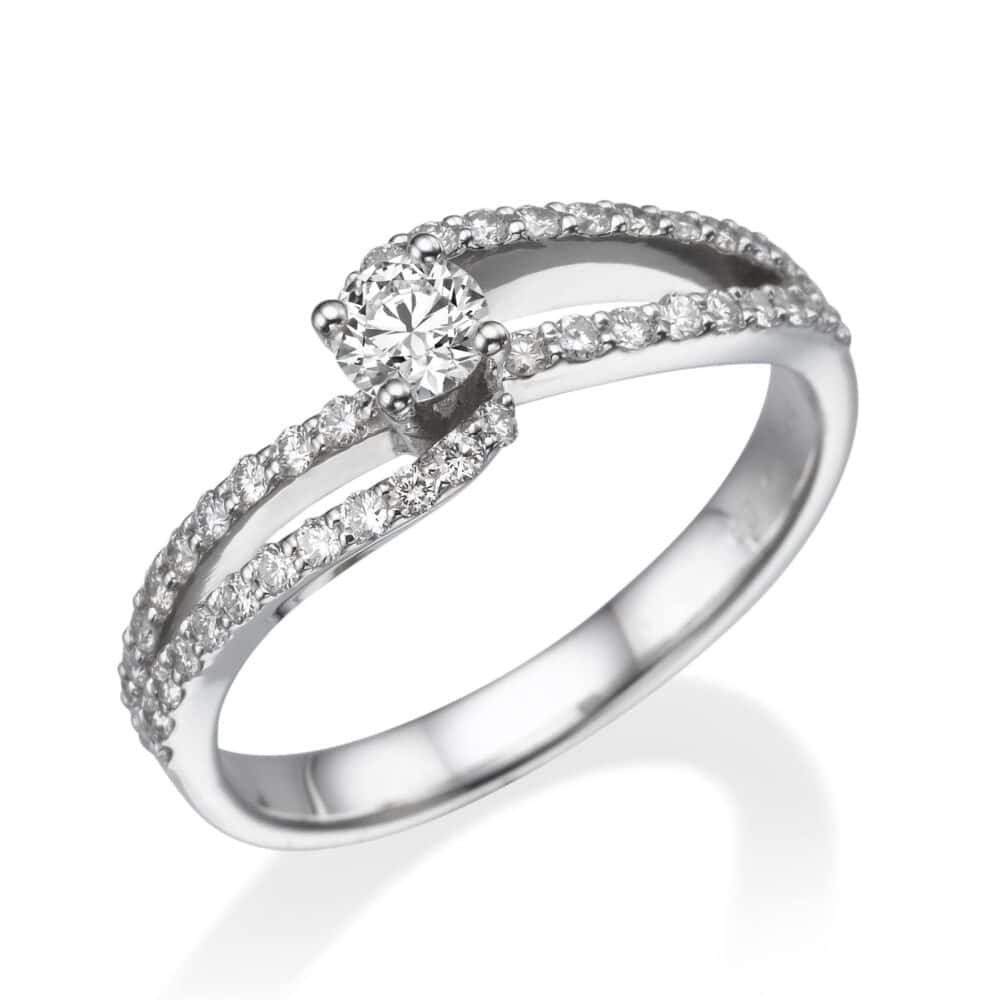 טבעת אירוסין טוויסט, זהב 14K לבן צהוב או ורוד, משובצת יהלום מרכזי במשקל 0.22 נקודות, ויהלומי צד במשקל כולל של 0.45 נקודות.
