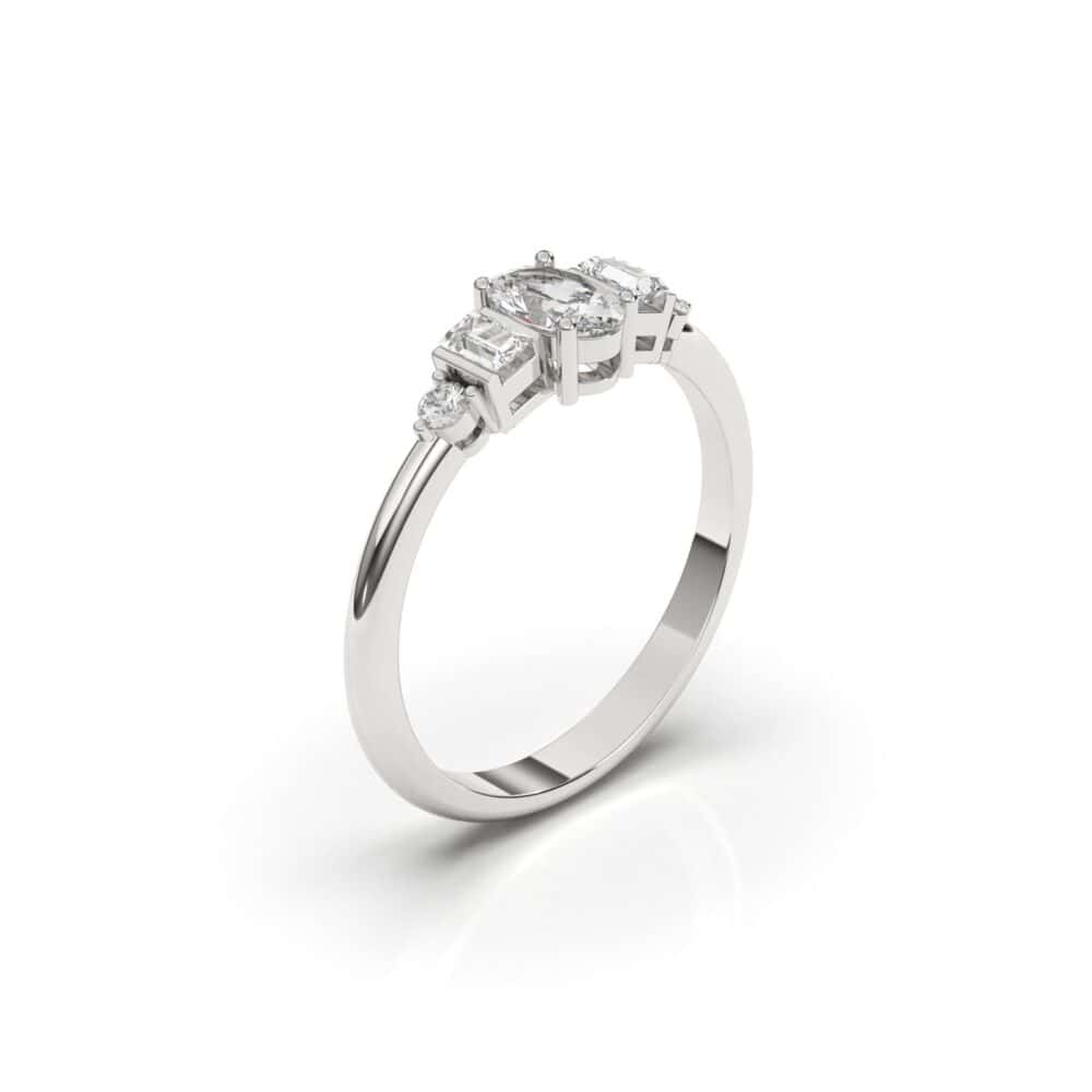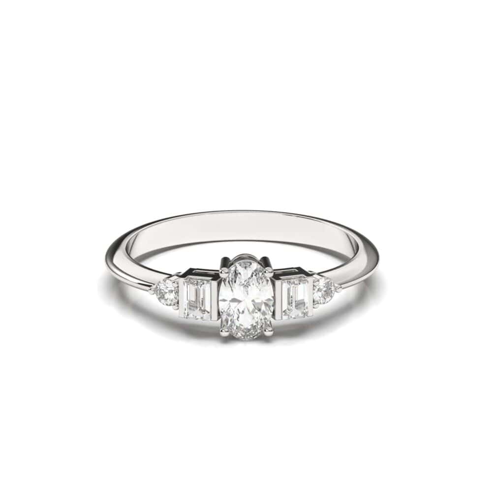 טבעת אירוסין אובל, זהב 14K לבן צהוב או ורוד. משובצת יהלום מרכזי 0.36 נקודות בחיתוך אובל. ויהלומי בגט בצד במשקל כולל של 0.16 נקודות ועוד שני יהלומים עגולים בצד במשקל 0.06 נקודת.