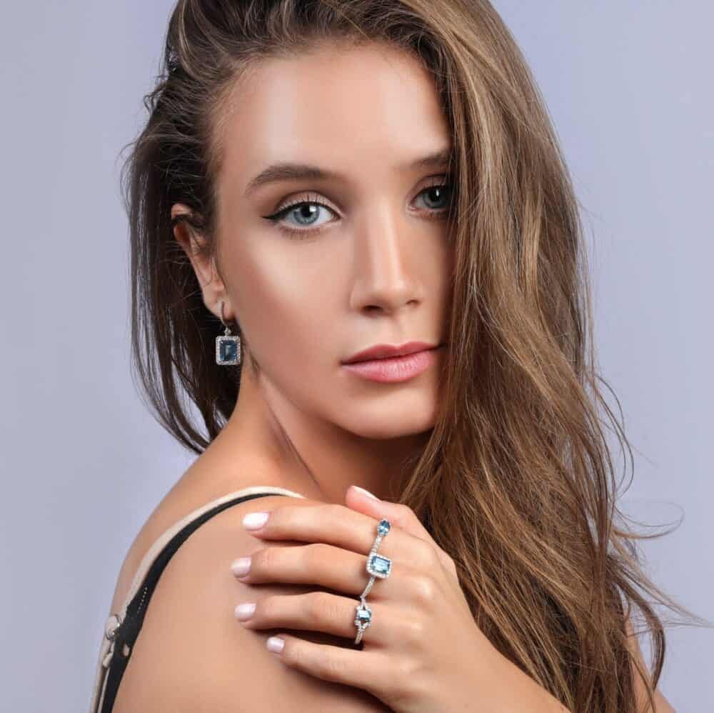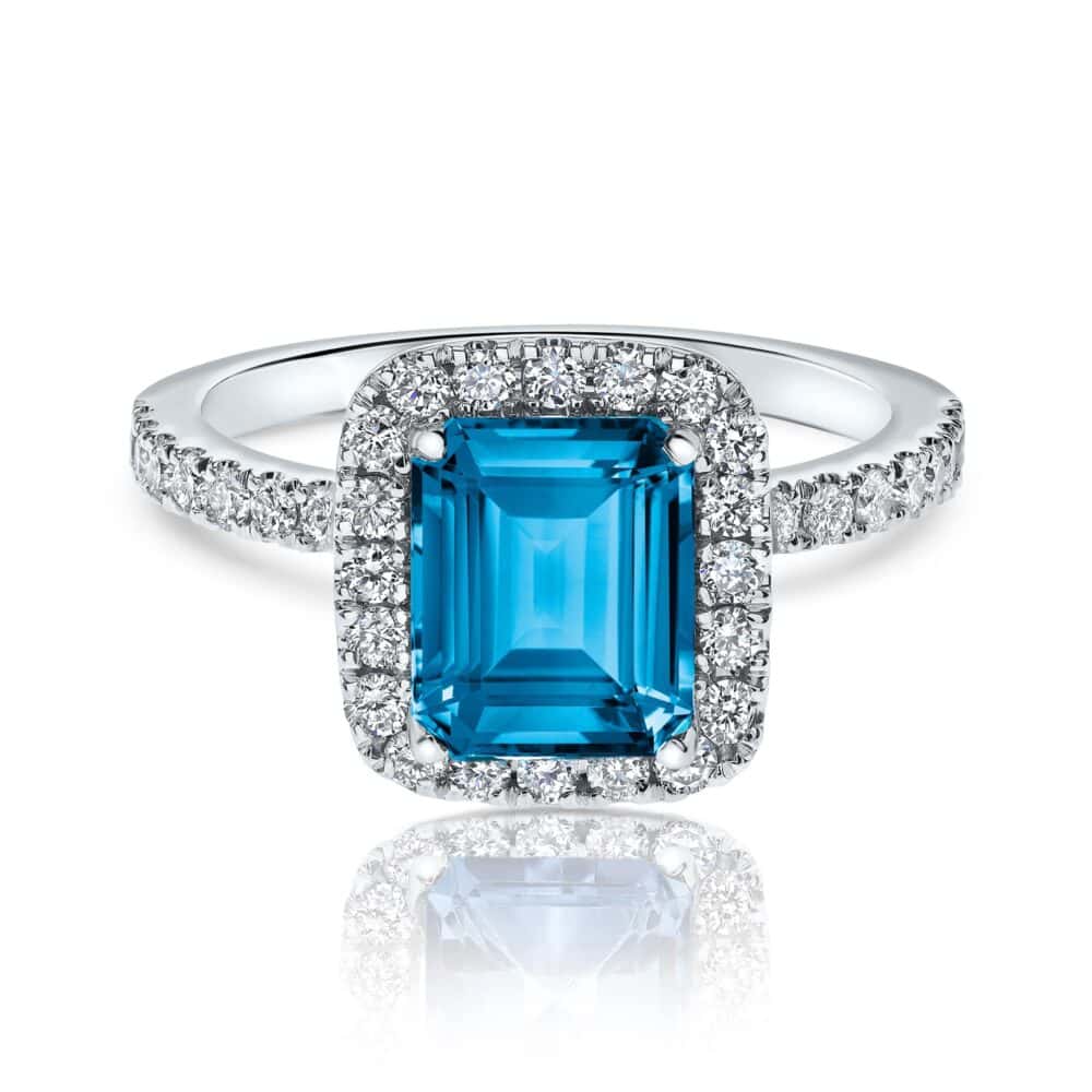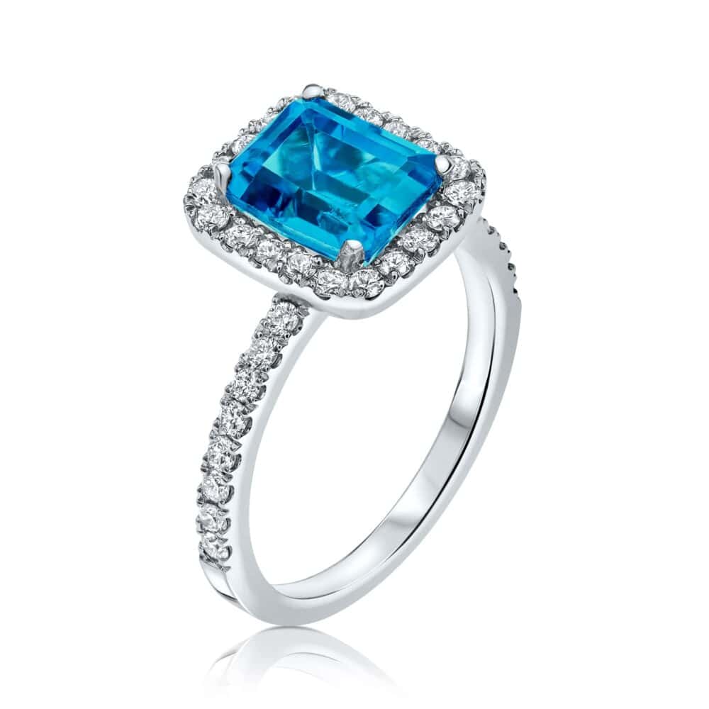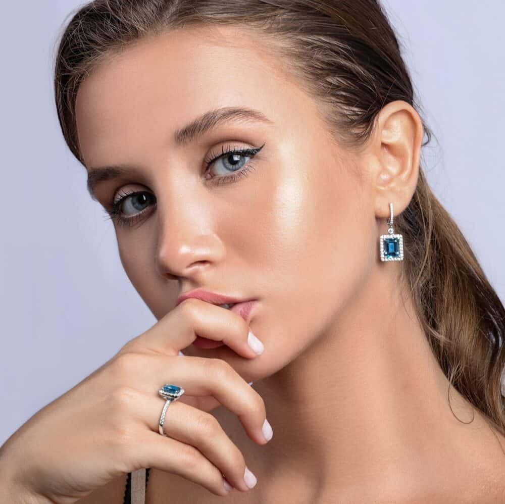 טבעת היילו בלו טופז לונדון מרשימה ויוקרתית, במרכזה משובצת אבן חן טופז מהפנטת בצבע כחול עמוק במשקל 3 קראט , המסמלת שלווה וצלילות. סביב הטופז משובצים יהלומים זעירים ומנצנצים במשקל 0.40 נקודות סה"כ, המקיפים את האבן המרכזית כמו הילה זוהרת, ומעניקים לטבעת נופך של יוקרה וברק אין-סופי. השילוב בין הטופז הזוהר לבין היהלומים המעודנים יוצר מראה מלכותי ומרשים, שהופך את הטבעת לפריט על-זמני עם נוכחות חזקה, המקרין יופי מעודן ואלגנטי.