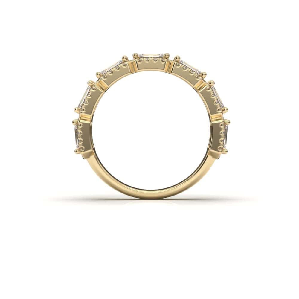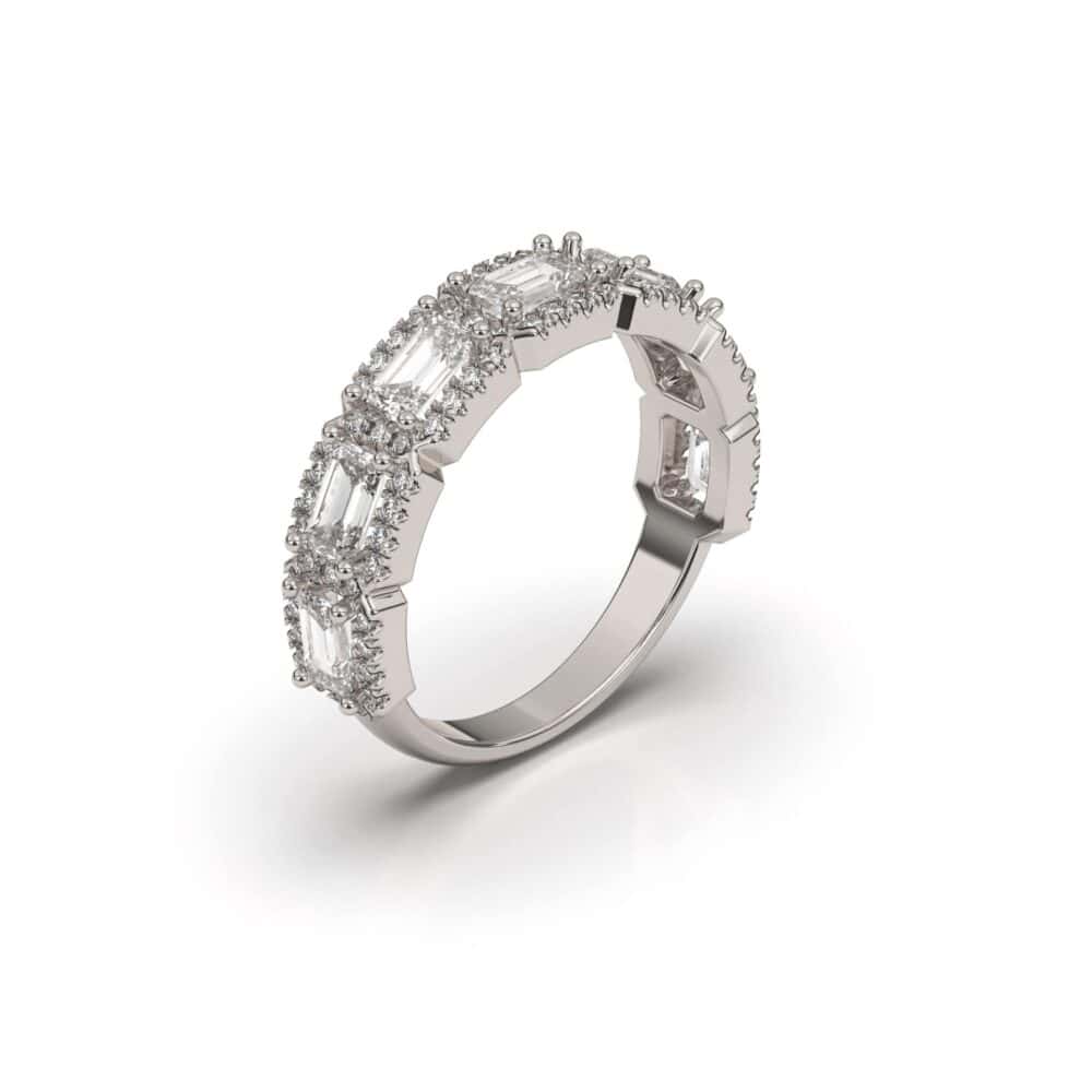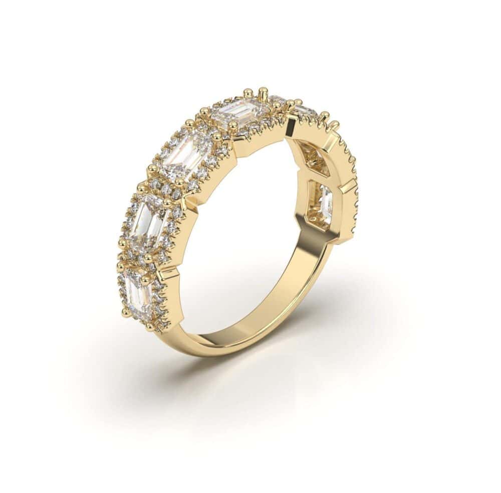 טבעת היילו יהלומים אמרלדים, זהב 14K לבן, צהוב או ורוד, משובצת 7 יהלומים במשקל 1.40 קראט סה"כ (כל יהלום מרכזי שוקל 0.20 נקודות) בחיתוך אמרלד ו80 יהלומי צד מסביב במשקל 0.30 נקודות סה"כ.