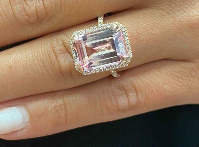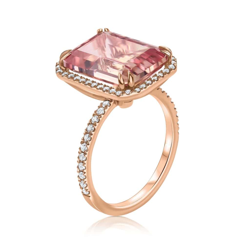 טבעת היילו מורגנייט ,זהב לבן, צהוב או ורוד 14K משובצת אבן חן מורגנייט ומסביב יהלומים במשקל 0.30 נקודות.