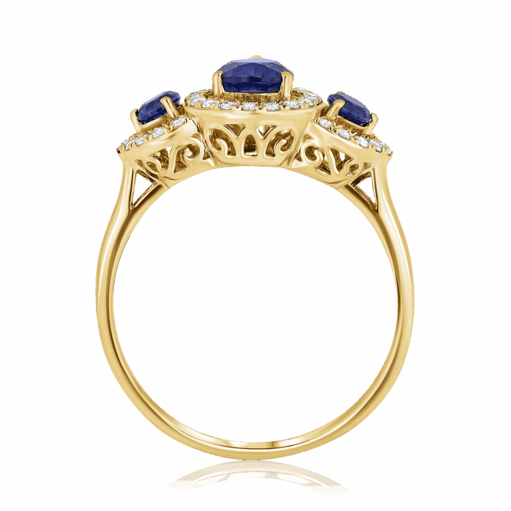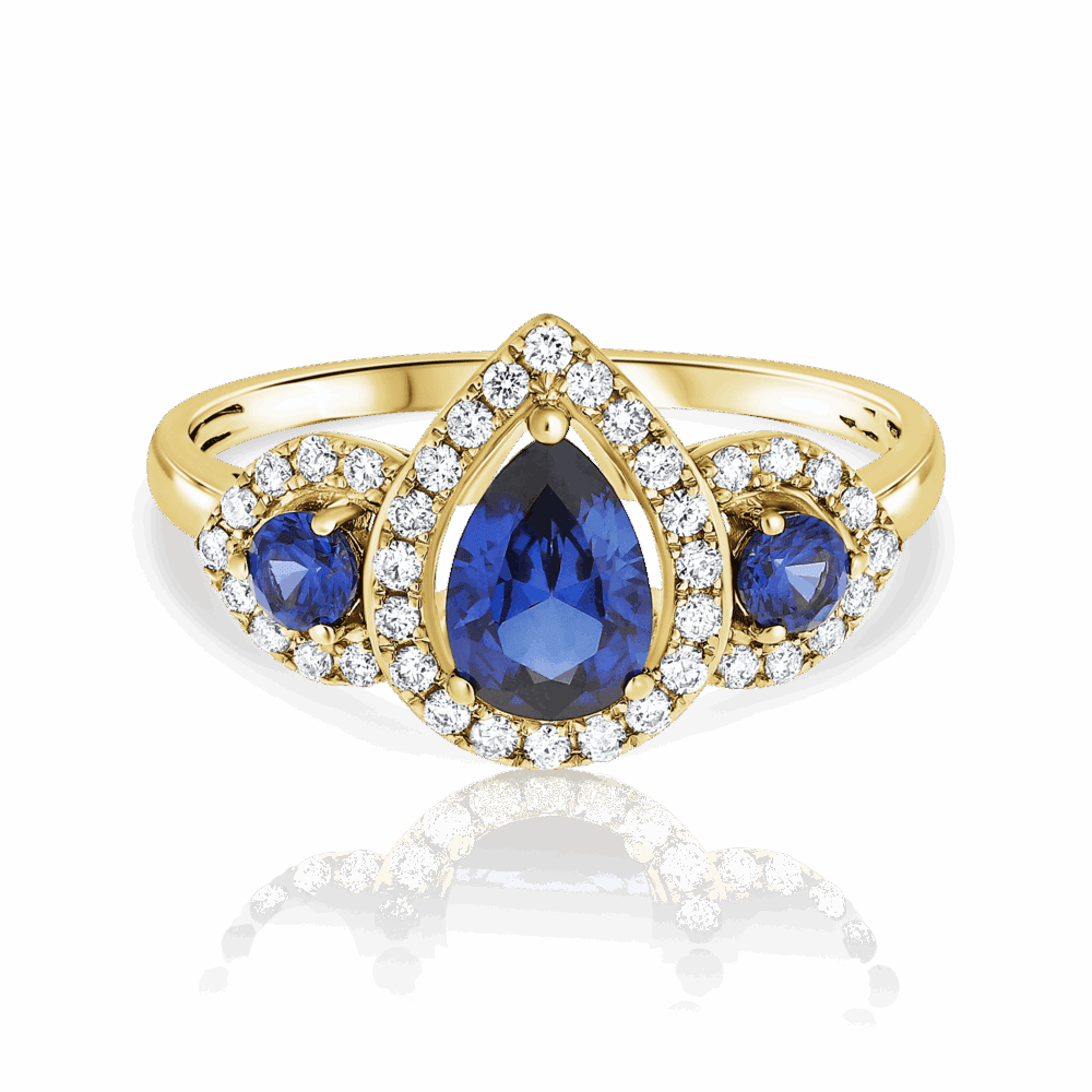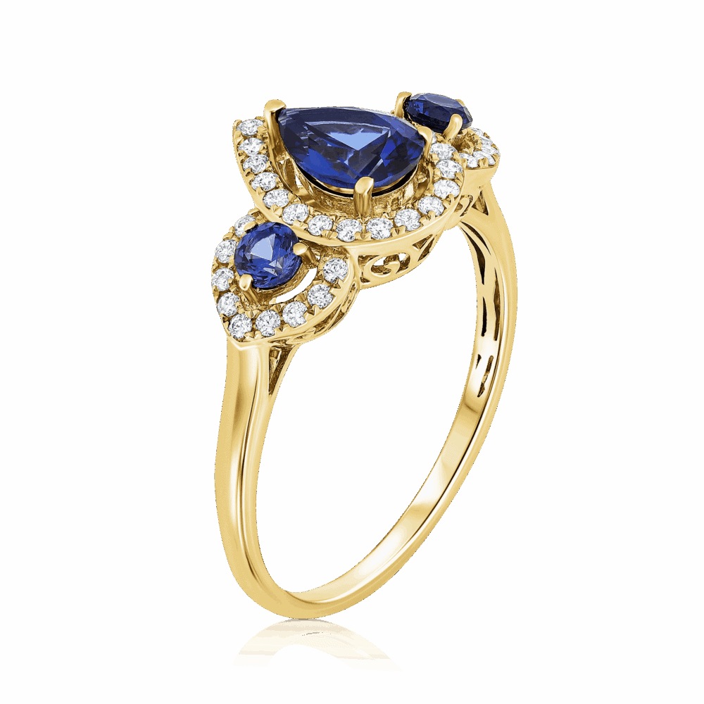 טבעת היילו מעוצבת ספיר ויהלומים ,זהב לבן, צהוב או ורוד 14K משובצת 38 יהלומים במשקל 0.24 נקודות ספיר טיפה במרכז במשקל 0.80 נקודות וזוג ספירים בצדדים במשקל 0.29 נקודות ביחד.