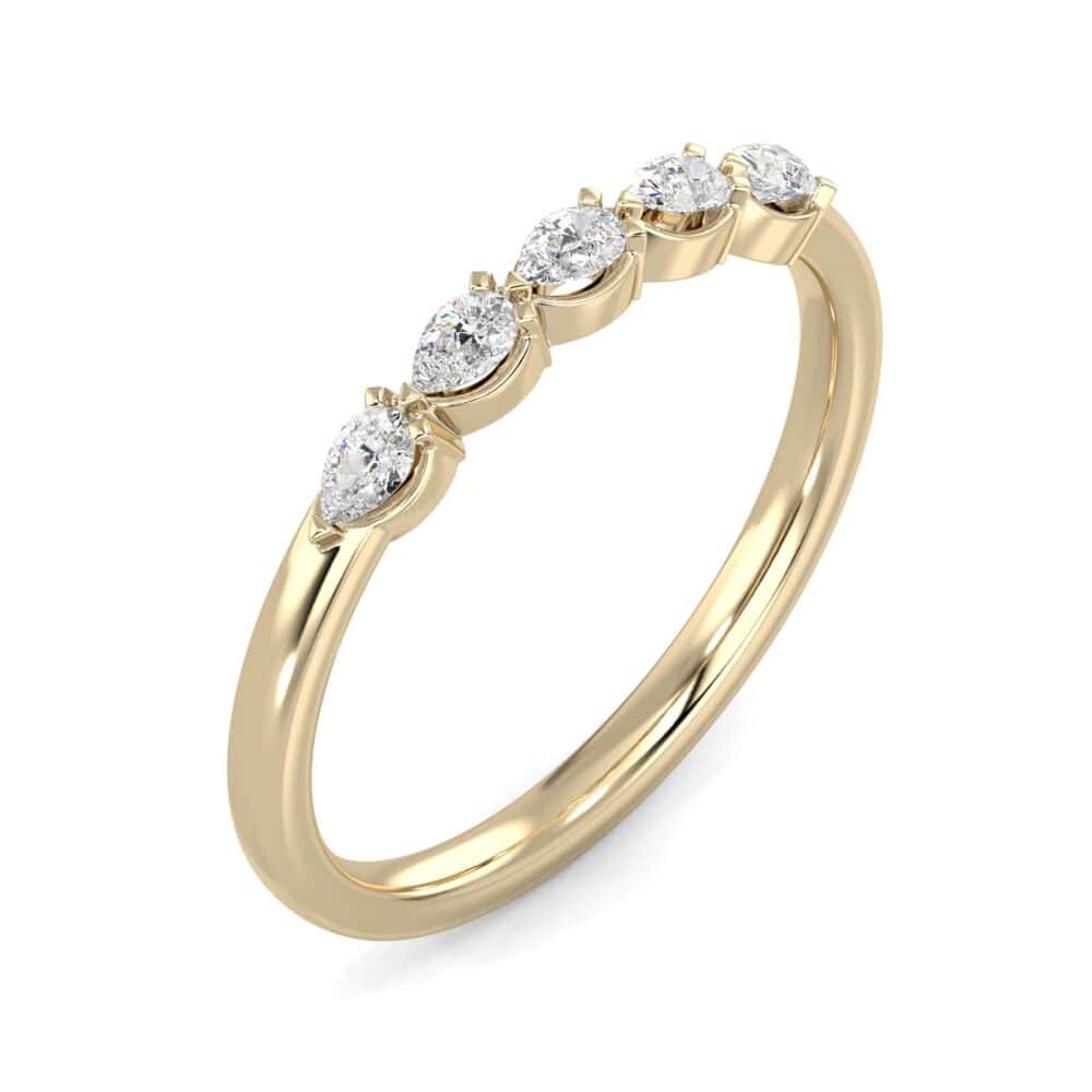 טבעת טיפות זו מעוטרת בחמישה יהלומים עדינים בחיתוך טיפה, כל אחד במשקל 0.10 קראט, היוצרים יחד מראה קלאסי ומתוחכם. חיתוך הטיפה הייחודי משלב בין האלגנטיות של עיצוב יהלומים מסורתי לבין תחכום מודרני, כשהיהלומים מסודרים בשורה מדויקת על גבי טבעת דקה ועדינה. עיצוב זה מדגיש את הברק המרהיב של כל יהלום ואת צורתו המיוחדת, ומעניק לטבעת נופך של אלגנטיות טבעית. זוהי טבעת שמתאימה במיוחד לנשים המחפשות מראה ייחודי ונצחי שמשדר עדינות ויוקרה באותו הזמן.