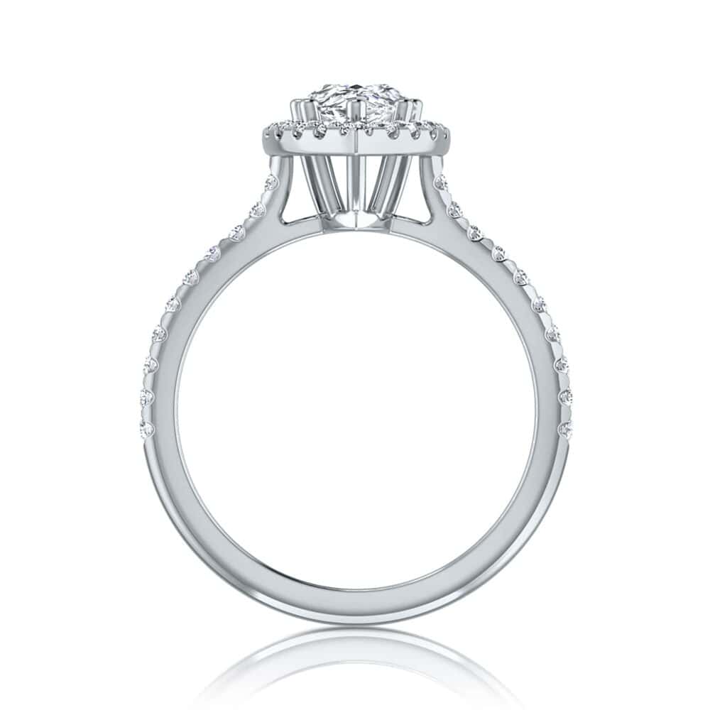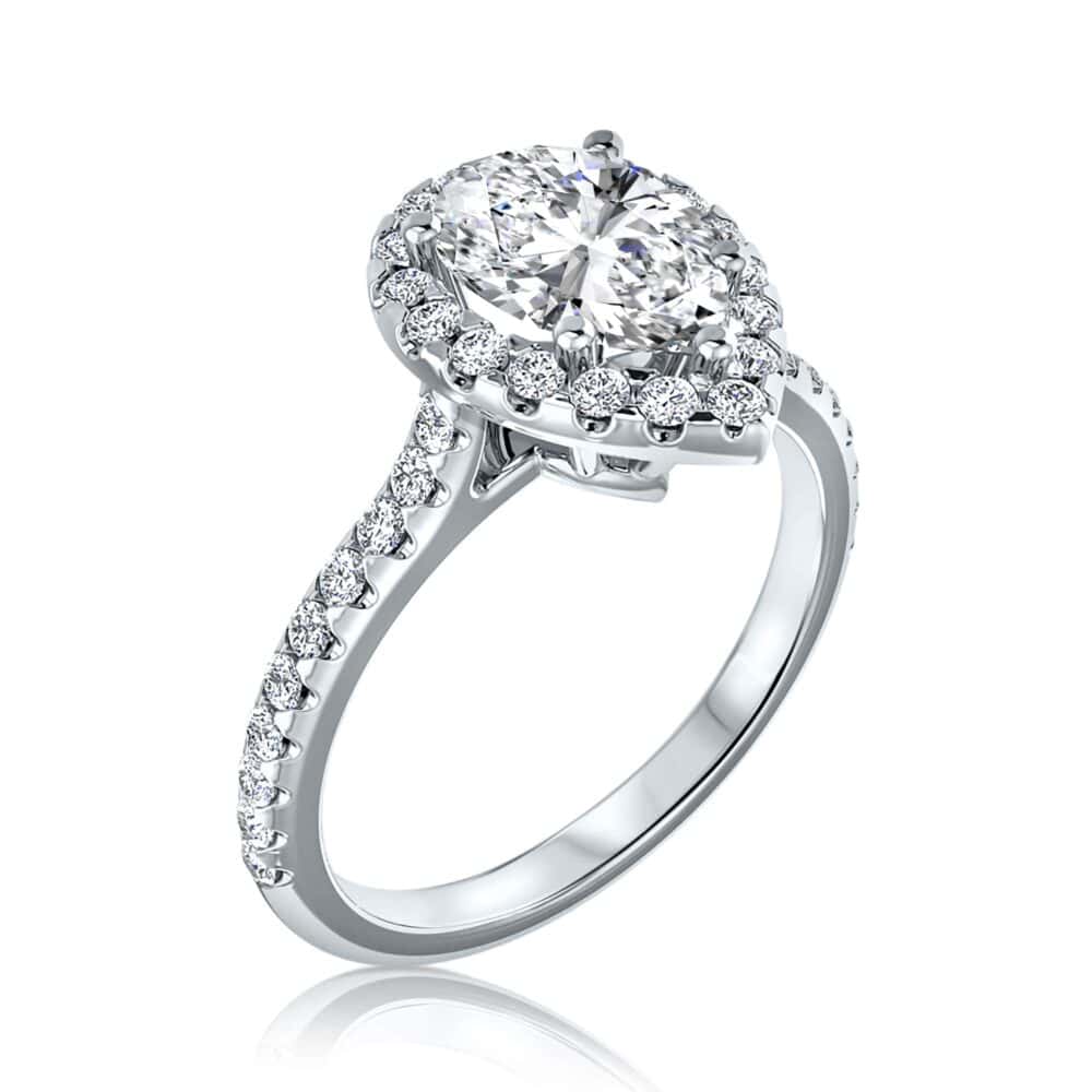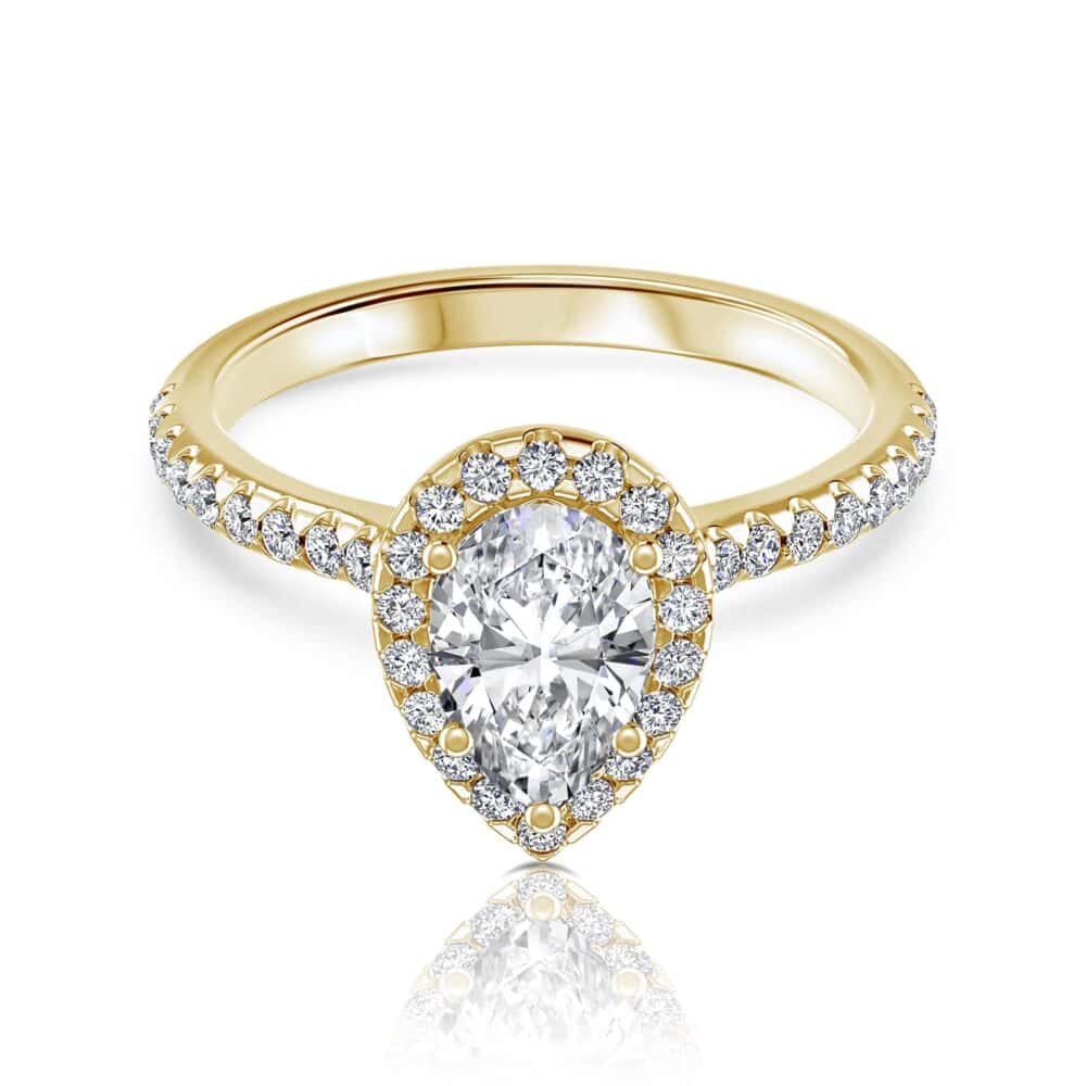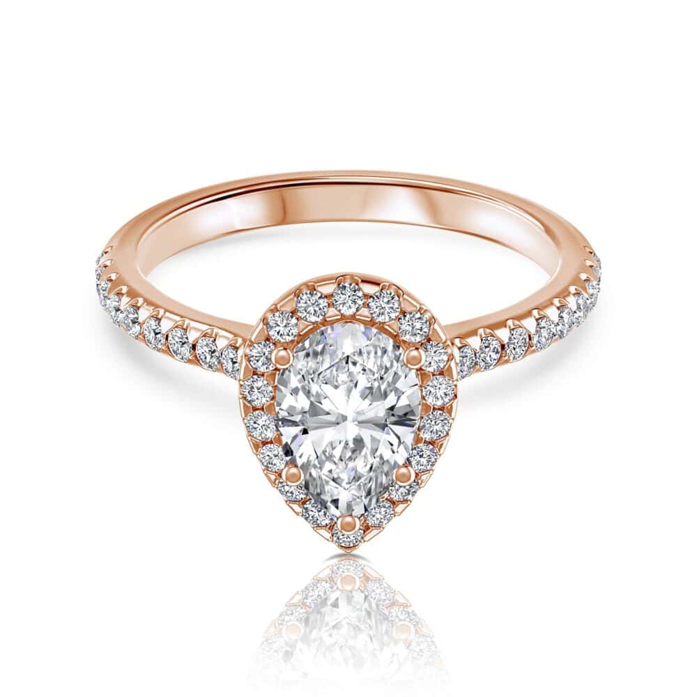 טבעת אירוסין היילו טיפה. מהממת משובצת יהלום מרכזי 1.00 קראט בחיתוך טיפה, מוקפת ביהלומים עגולים מנצנצים באלגנטיות. זהב 14K לבן, צהוב או ורוד, ויהלומי צד במשקל 0.20 נקודות.