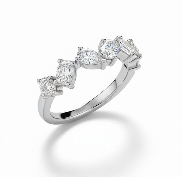 טבעת יוקרתית ומרשימה מזהב איכותי, משובצת יהלומים טבעיים בצורות שונות, היוצרים מראה אלגנטי, עשיר ומלא נוכחות. שילוב היהלומים בגדלים ובחיתוכים מגוונים מעניק לטבעת עומק, ברק וייחודיות יוצאת דופן.