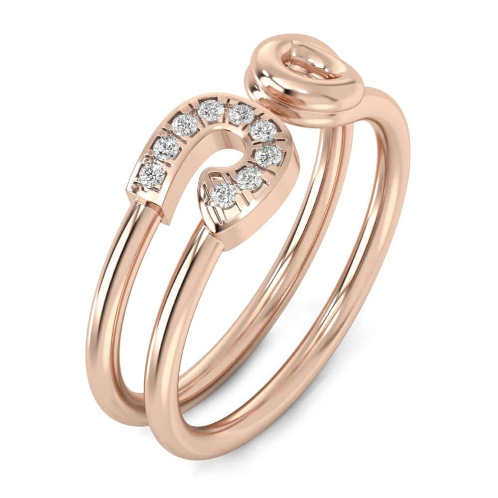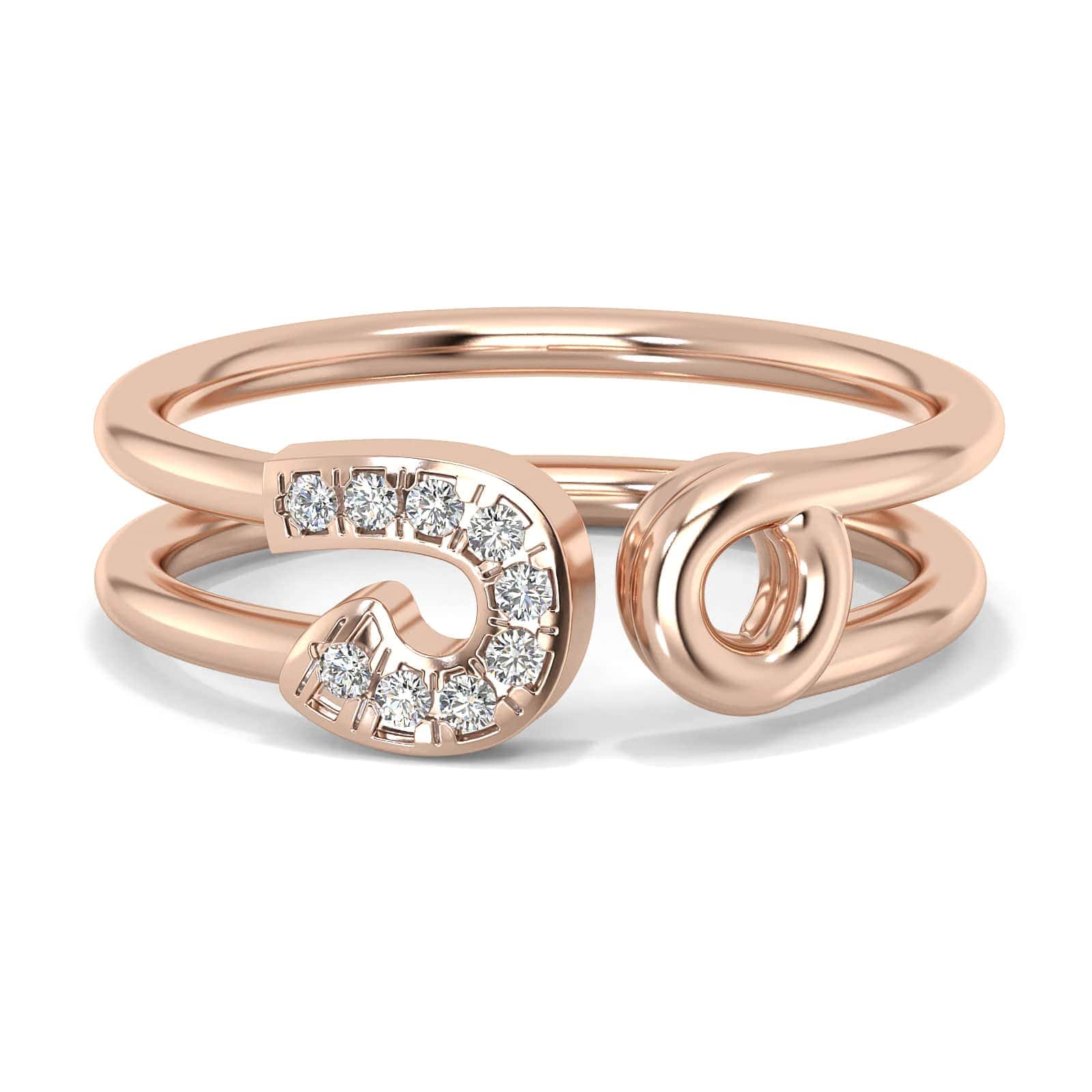 טבעת סיכת ביטחון, זהב לבן, צהוב או ורוד 14K משובץ 9 יהלומים משקל 0.07 נקודות סה"כ.