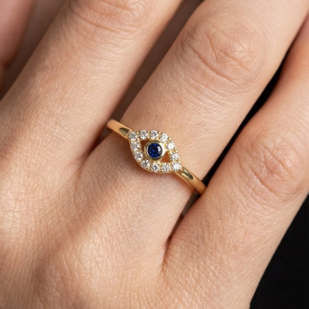 טבעת עין יוקרתית ומרשימה, משובצת ספיר כחול במרכז ויהלומים לבנים נוצצים מסביב. העיצוב האלגנטי משלב בין יוקרה על-זמנית לסמליות עמוקה של הגנה, עוצמה וסטייל.