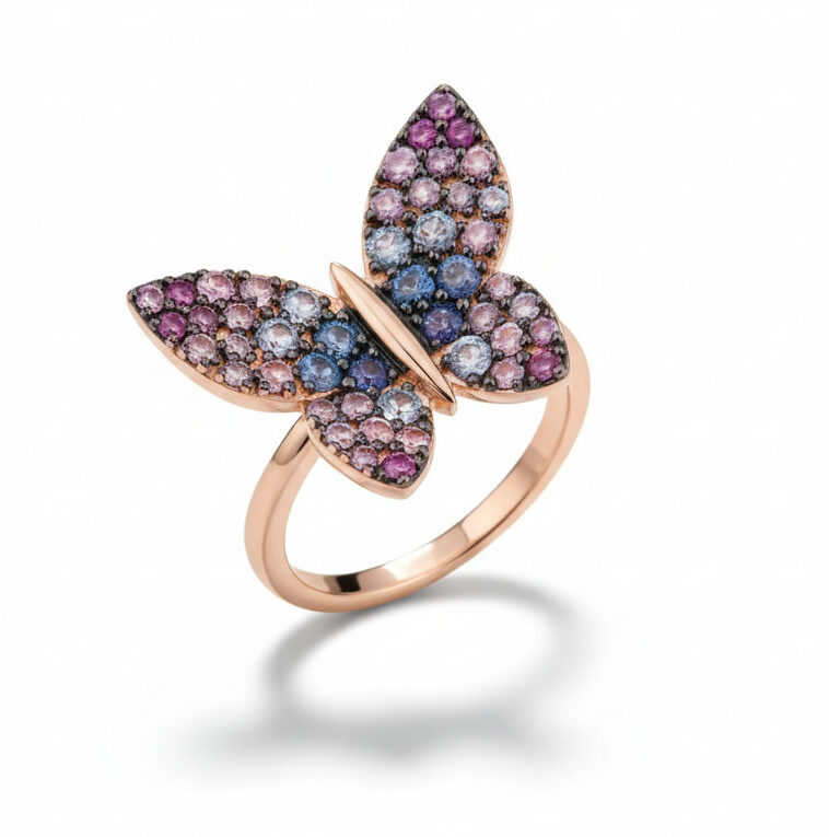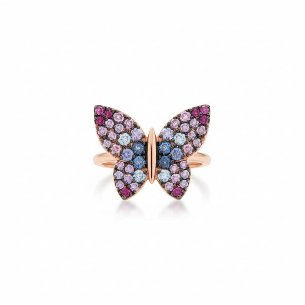 טבעת פרפר אבני חן, זהב לבן, צהוב או ורוד 14K משובץ יהלומים