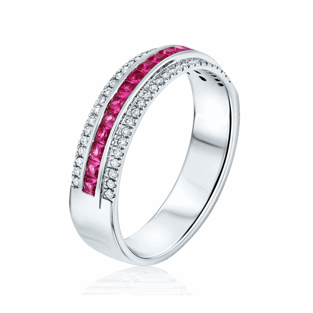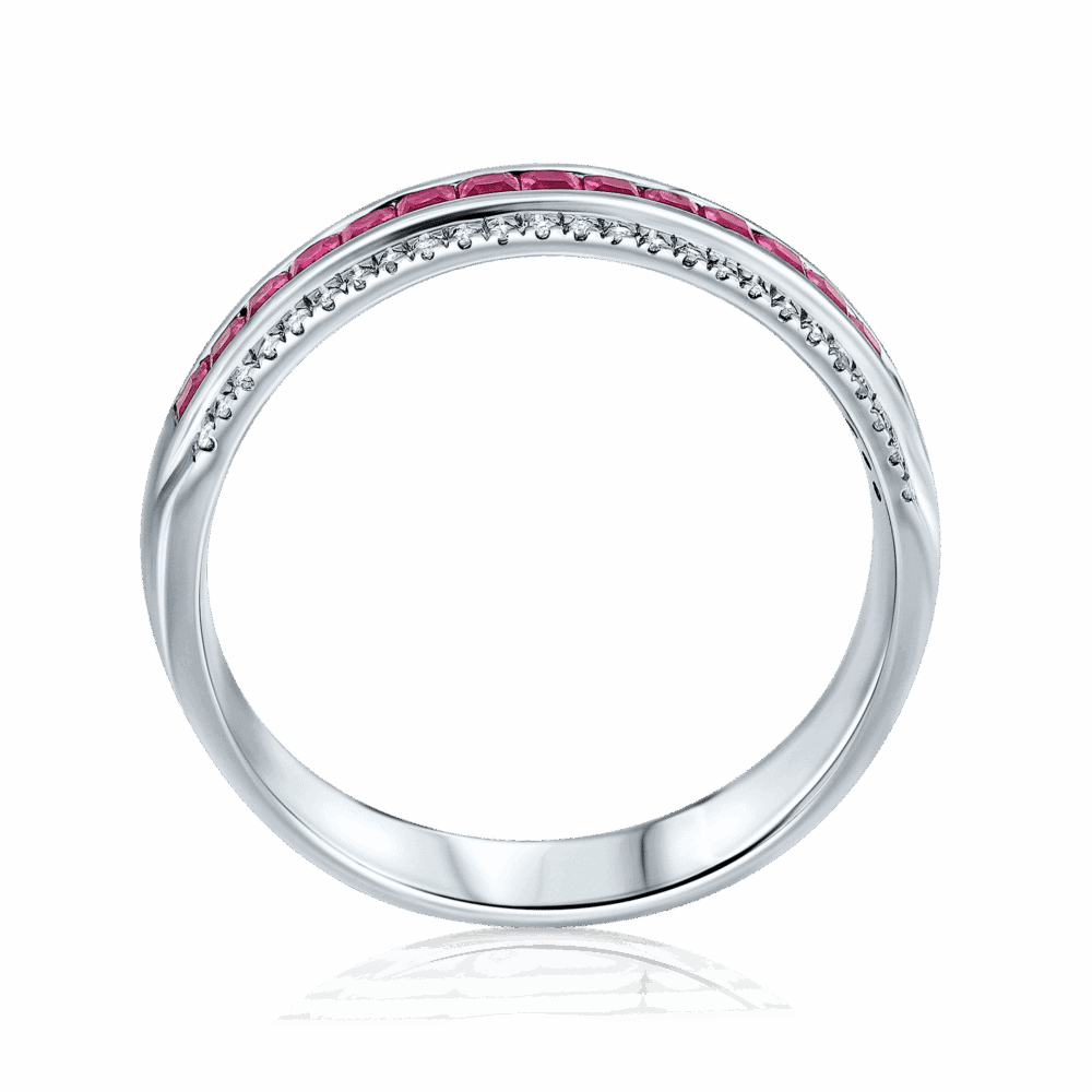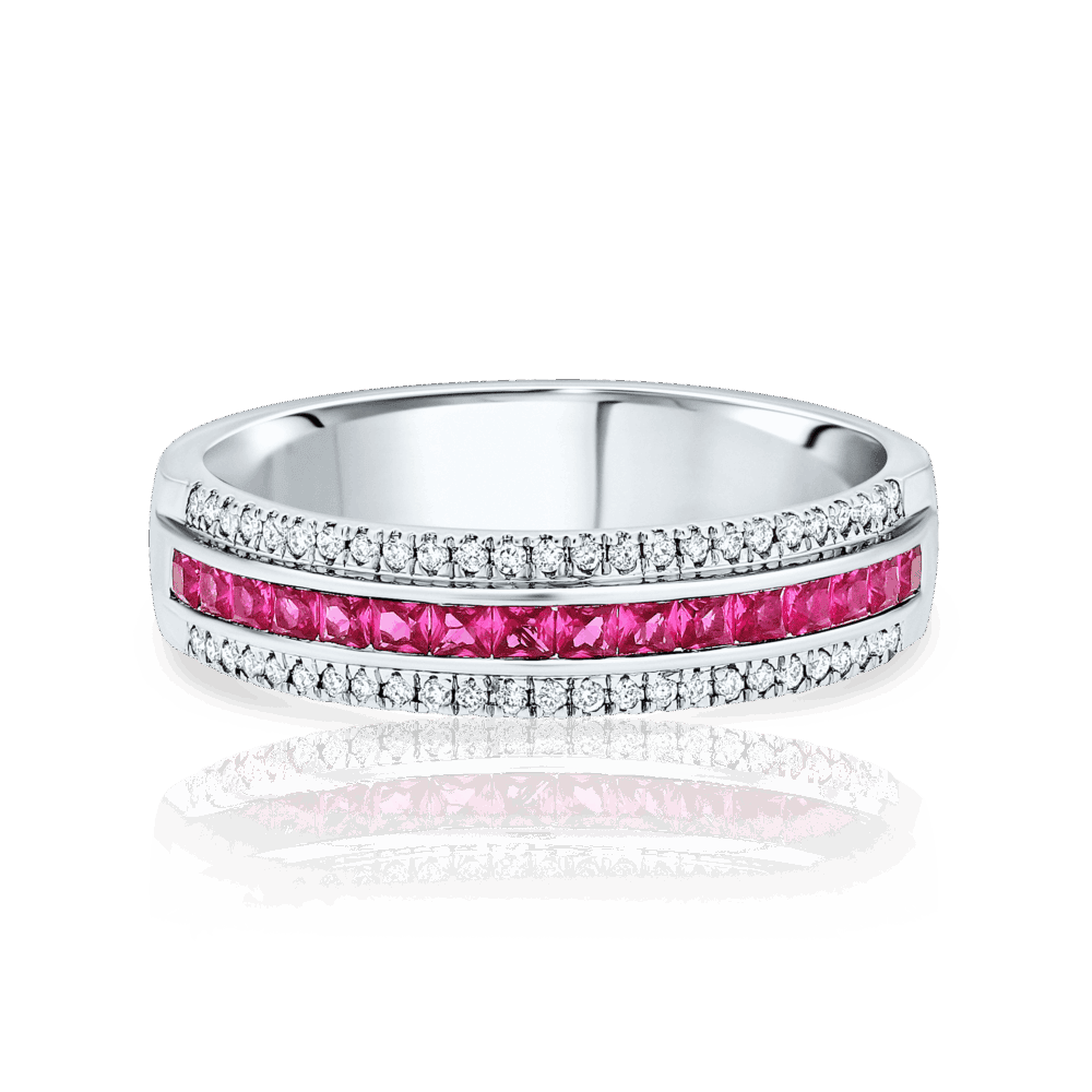 טבעת שורות מעוצבת ,זהב לבן, צהוב או ורוד 14K משובצת 50 יהלומים במשקל 0.13 נקודות. ו18 אבני חן רובי באמצע במשקל 0.41 נקודות.