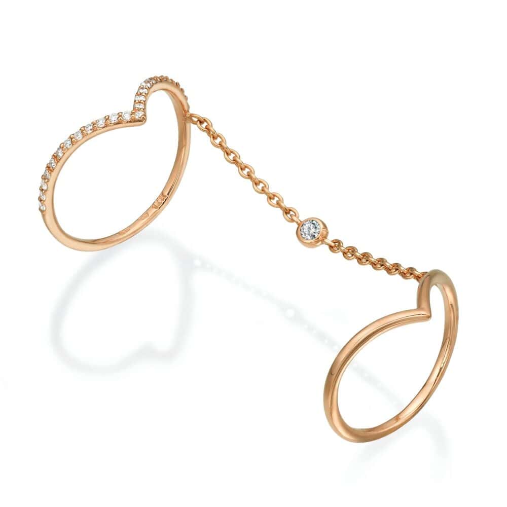 סט 2 טבעות המיוחד הזה כולל שתי טבעות אלגנטיות המחוברות באמצעות שרשרת עדינה עם יהלום משובץ בבית אבן, היוצרת עיצוב ייחודי ומודרני. הטבעות עשויות מזהב 14K לבן צהוב או ורוד ומעוטרות בקפידה עם יהלומים, המוסיפים נופך של זוהר. השרשרת הדקיקה, המתחברת בין הטבעות, לא רק שמוסיפה יופי אלא גם מעניקה תחושת תנועה וזרימה לתכשיט. השילוב בין הטבעות והשרשרת יוצר פריט תכשיט מושלם למי שמחפש להוסיף טאץ' של חדשנות וסטייל למראה היומיומי או לאירועים מיוחדים.