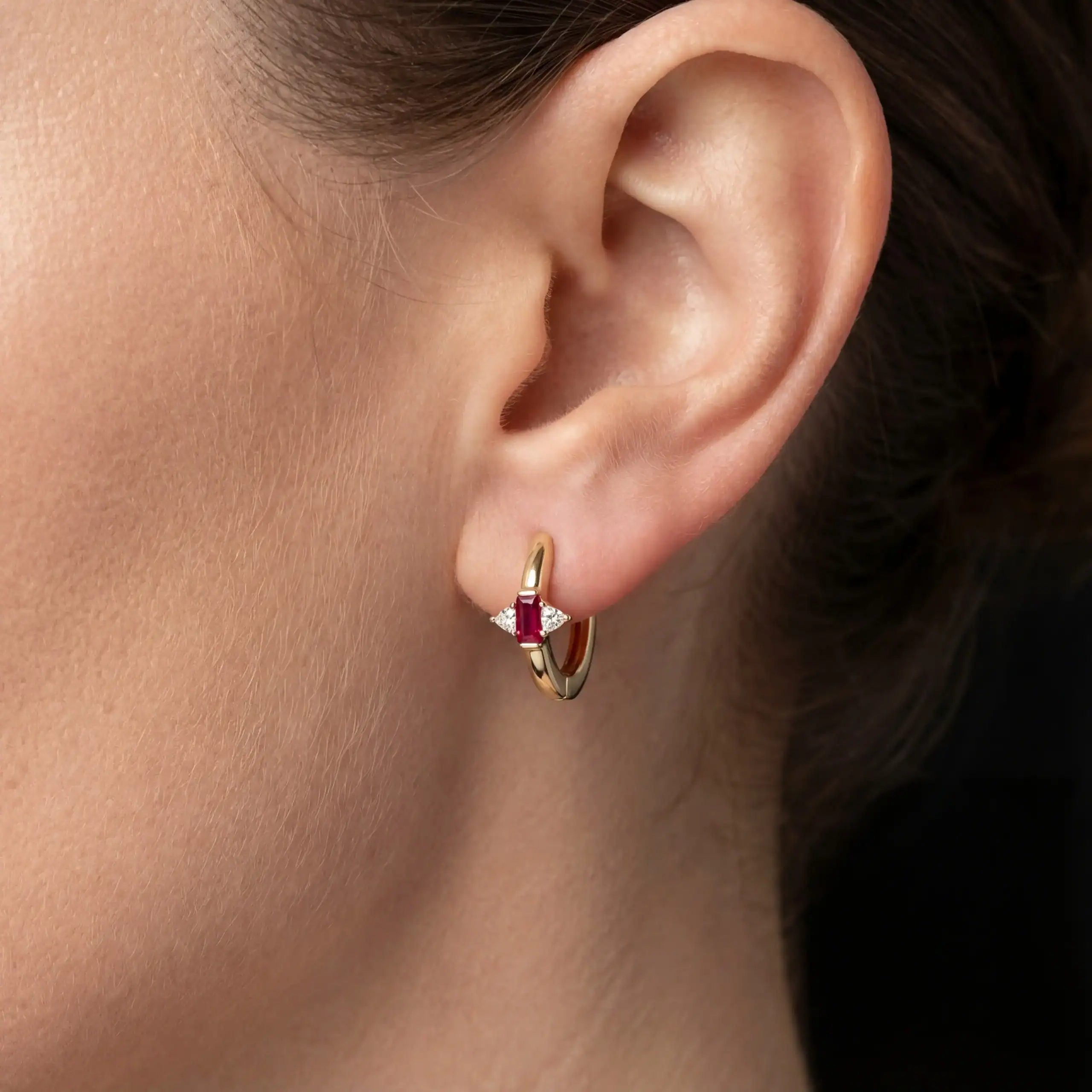 עגילי חישוק מעוצבים עם רובי ויהלומים – Shari, זהב לבן, צהוב או ורוד 14K משובץ יהלומים