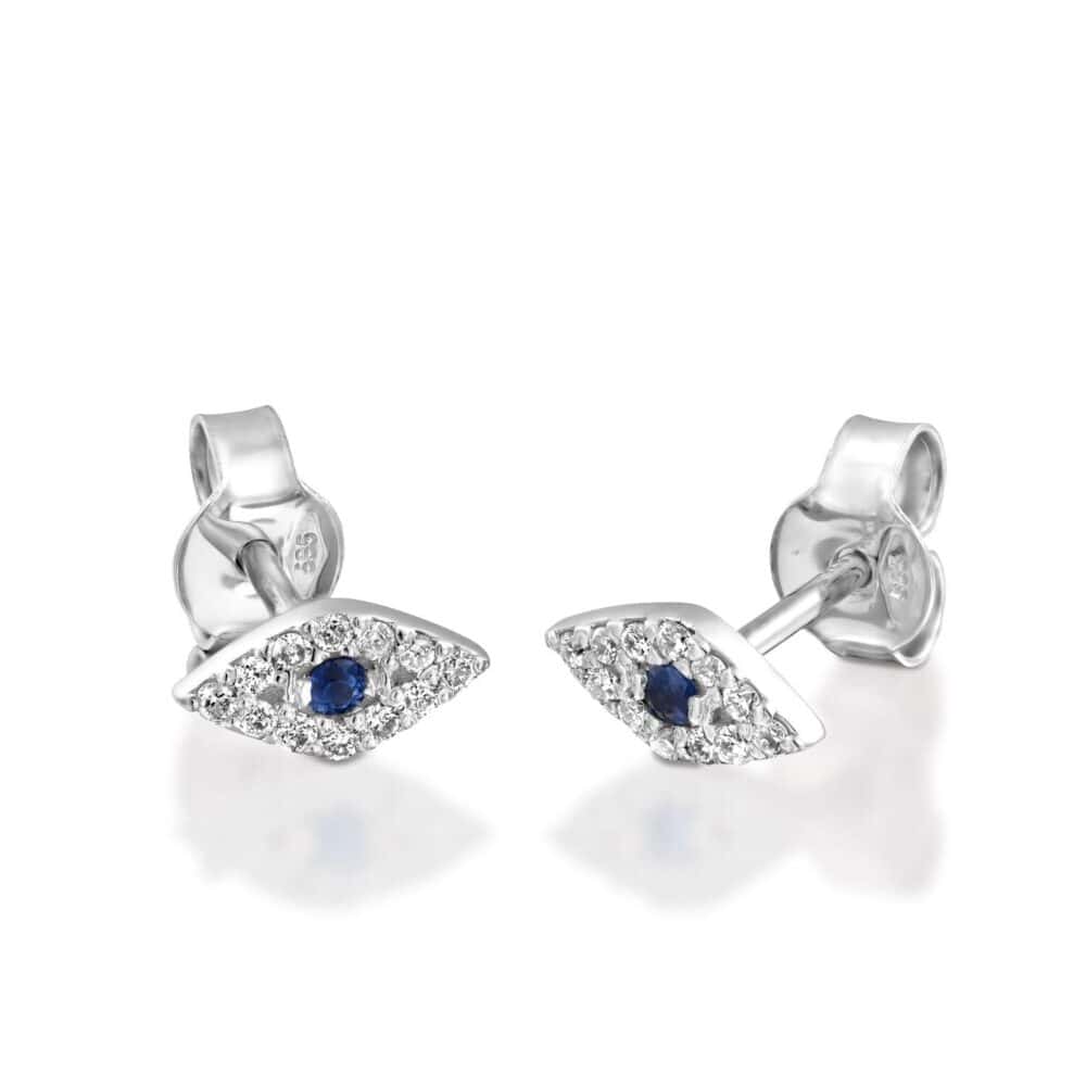 עגילי עין ספיר ויהלומים ,זהב 14K לבן צהוב או ורוד, במשקל 0.90 גרם, משובץ 2 ספיר כחול, ויהלומים במשקל כולל של 0.16 קראט.