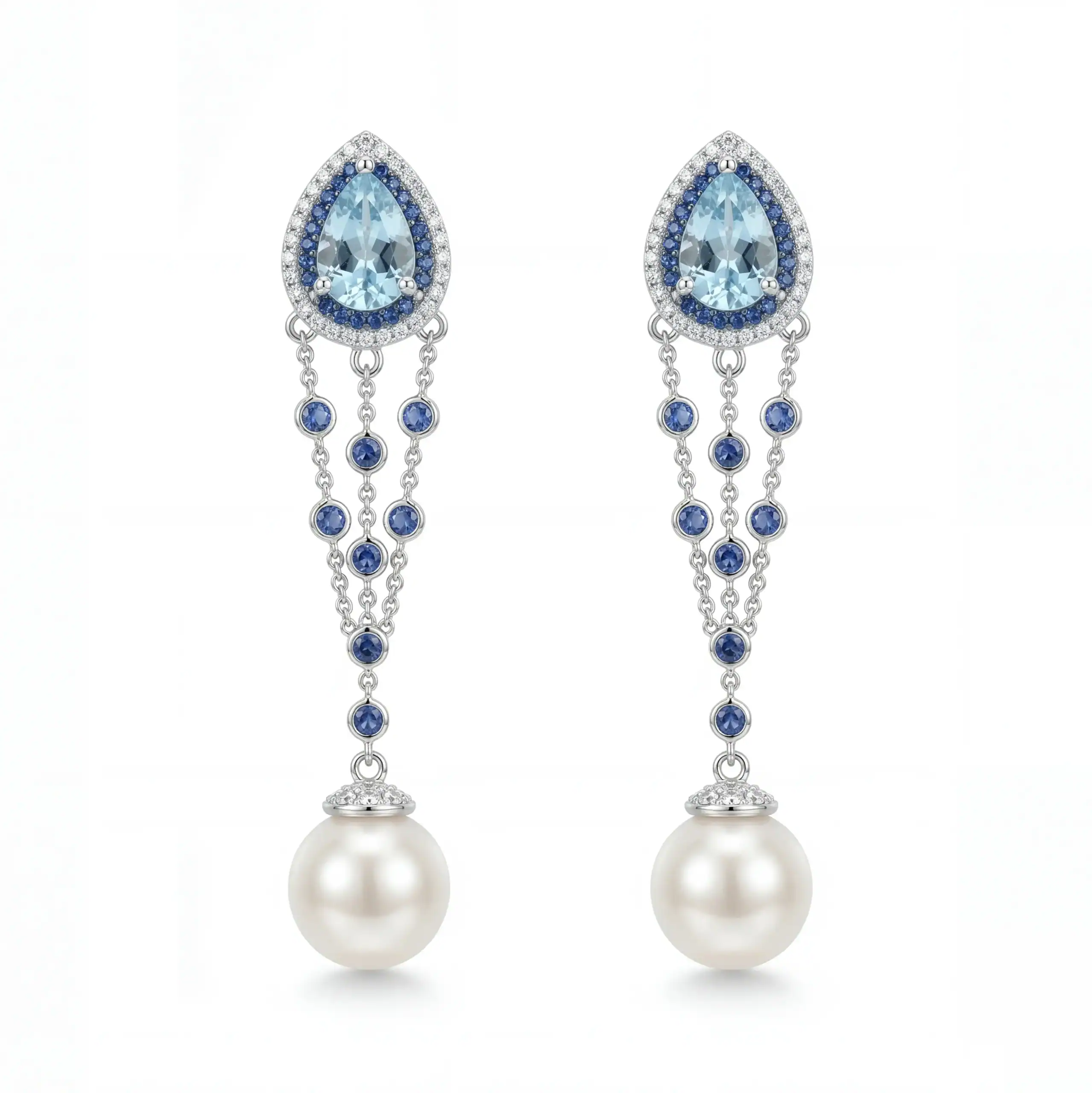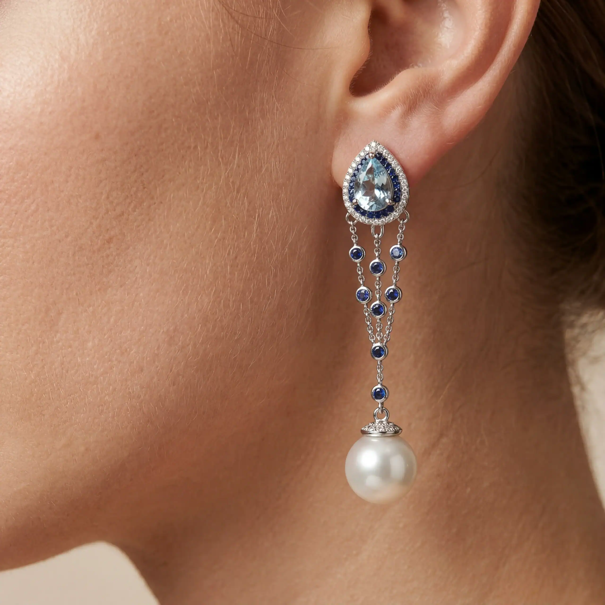 עגילי פנינים יהלומים בלו טופז וספירים