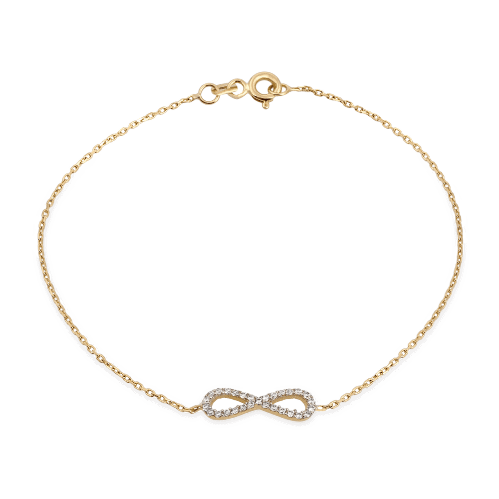 צמיד האינפיניטי מזהב 14K לבן, צהוב או ורוד המשובץ 29 יהלומים במשקל 0.30 נקודות סה"כ. סמל לאהבה נצחית ולקשר בלתי נשבר. הצמיד מעוצב בצורה אלגנטית של סימן האינפיניטי, המסמל נצחיות ואלגנטיות ללא פשרות. לאורך כל הסימן משובצים יהלומים נוצצים ועדינים, אשר מוסיפים זוהר וברק לכל תנועה. היהלומים נבחרו בקפידה, כך שיתאימו באופן מושלם לעיצוב המתמשך של האינפיניטי. זהו צמיד שמביע לא רק טעם יוקרתי ועדין, אלא גם משמעות עמוקה של קשר נצחי ואהבה אמיתית. צמיד האינפיניטי המשובץ יהלומים מתאים כמתנה לאירועים חשובים או כתוספת יוקרתית לכל אוסף תכשיטים.