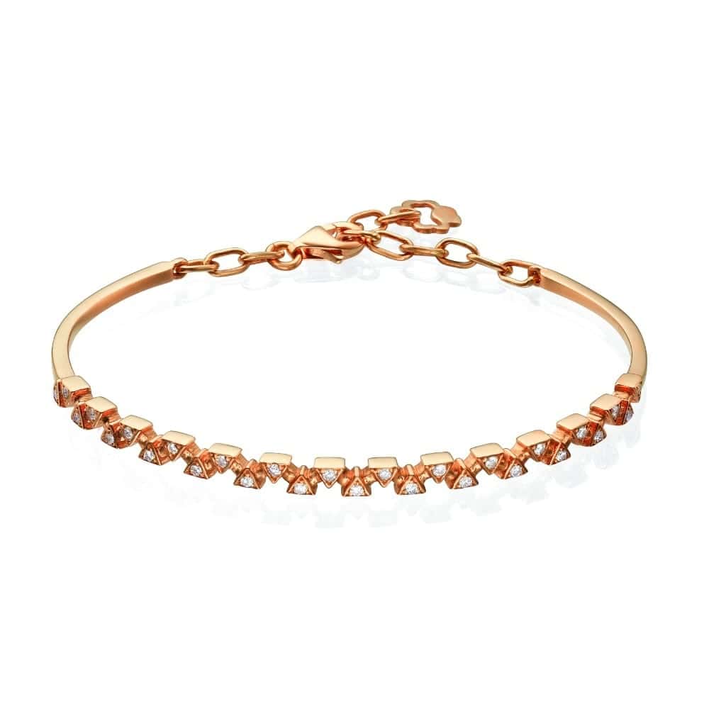 צמיד קשיח מעוצב ,זהב 14K לבן, צהוב או ורוד, משובץ 28 יהלומים במשקל 0.42 נקודות. צמיד מודרני ומרהיב, המעוצב ממשולשים קטנים וסימטריים. כל משולש משובץ ביהלום נוצץ שמוסיף לצמיד ברק ויוקרה. עיצוב המשולשים יוצר דפוס גיאומטרי ייחודי שמתבלט על פרק כף היד ומעניק לצמיד מראה מתוחכם ועדכני. היהלומים האיכותיים המשובצים במדויק בתוך כל משולש מוסיפים נופך של זוהר ואלגנטיות. צמיד זה הוא תוספת ייחודית לכל אוסף תכשיטים, המשלב בין עיצוב חדשני לבין יוקרה קלאסית, ומתאים לכל אירוע מיוחד בו רוצים להרשים ולהתבלט.