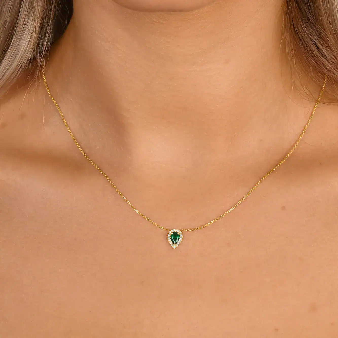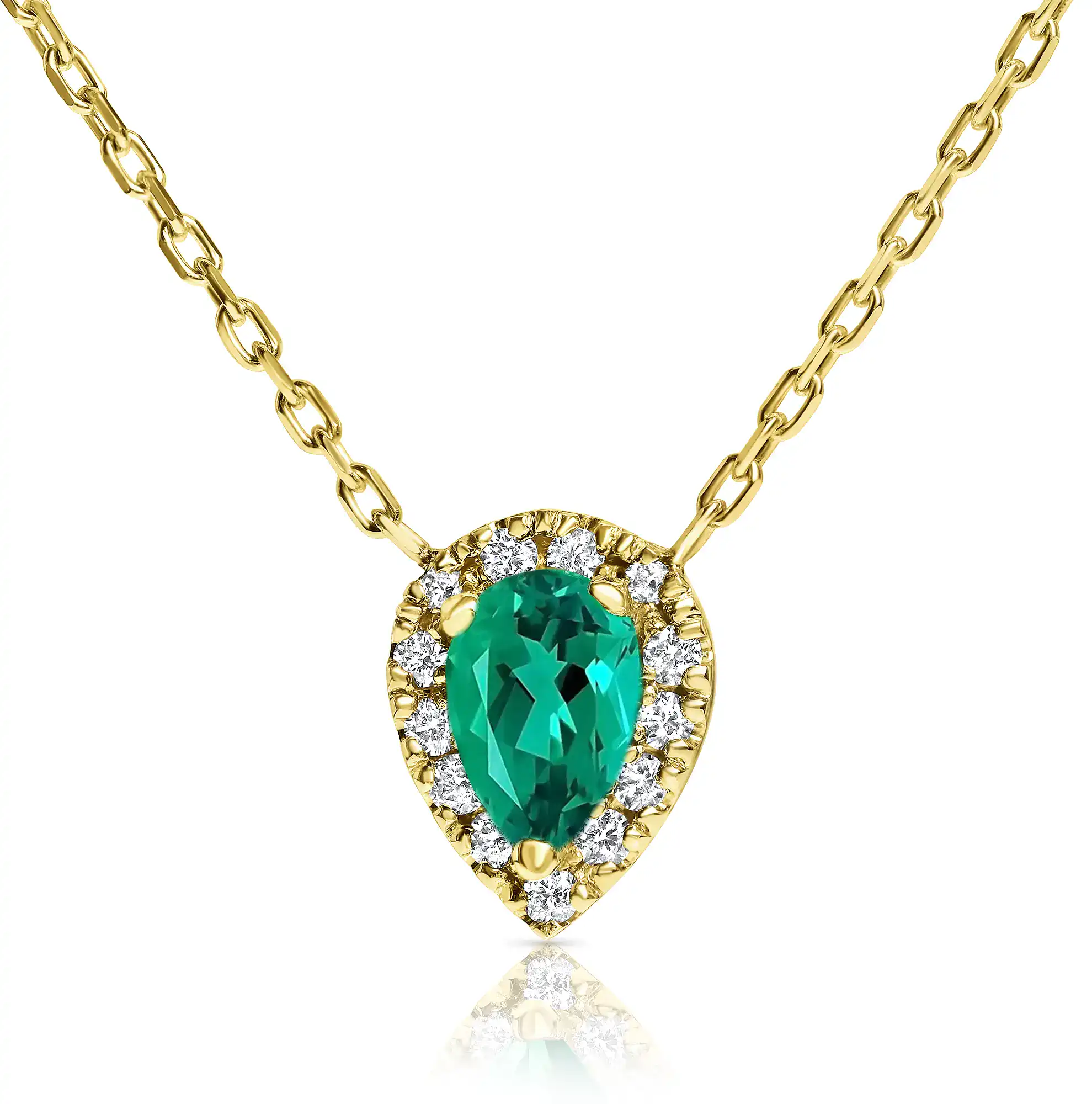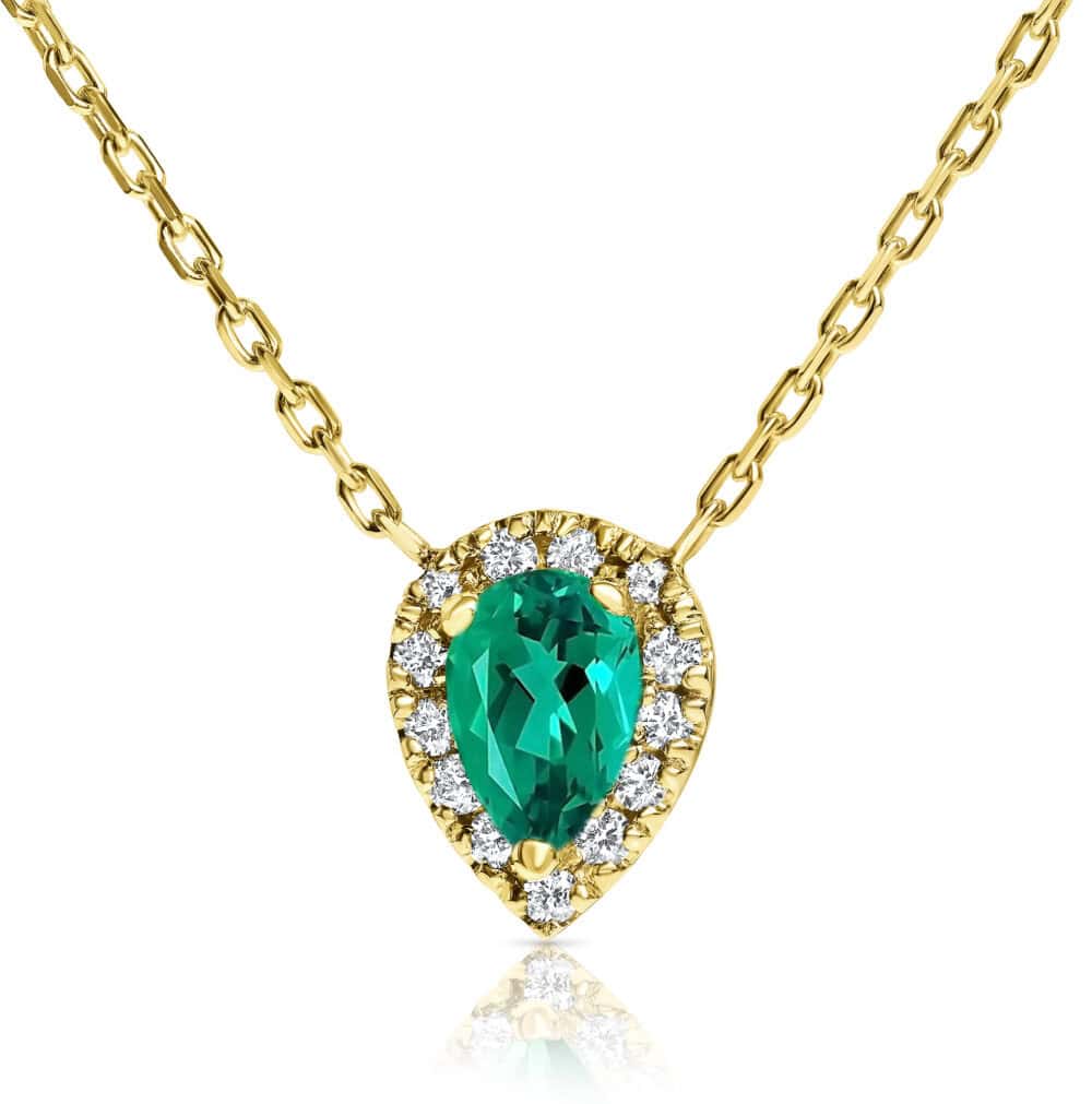 תליון היילו טיפה אמרלד (סינטטי), זהב 14K לבן, צהוב או ורוד , משובץ אבן חן (סינטטית) במרכז ויהלומים במשקל כולל של 0.10 קראט מסביב.