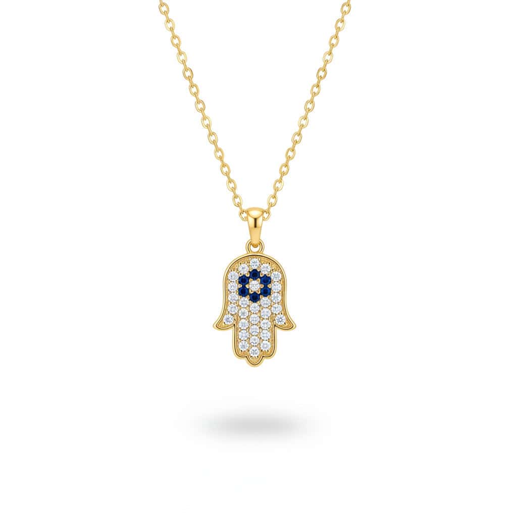 תליון חמסה יוקרתי בעיצוב אלגנטי, משובץ ביהלומים נוצצים ואבן ספירים כחולים מעוררת השראה.