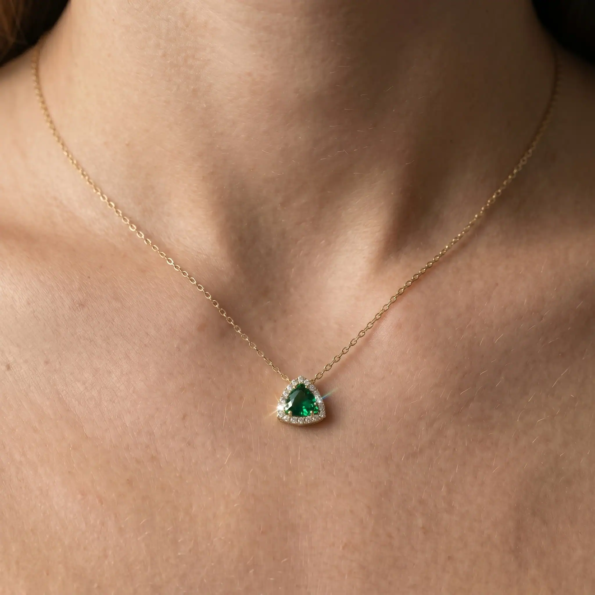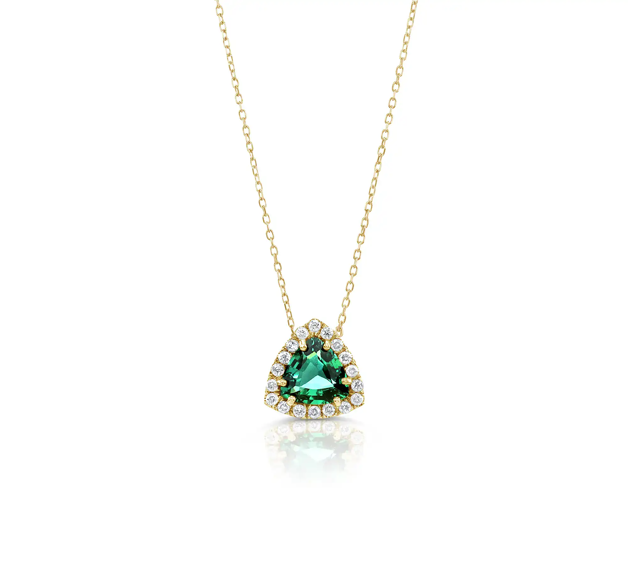 תליון משולש אמרלד, זהב 14K לבן צהוב או ורוד ,משובצת אבן חן אמרלד במרכז ויהלומי צד במשקל כולל של 0.15 נקודות. כולל שרשרת.