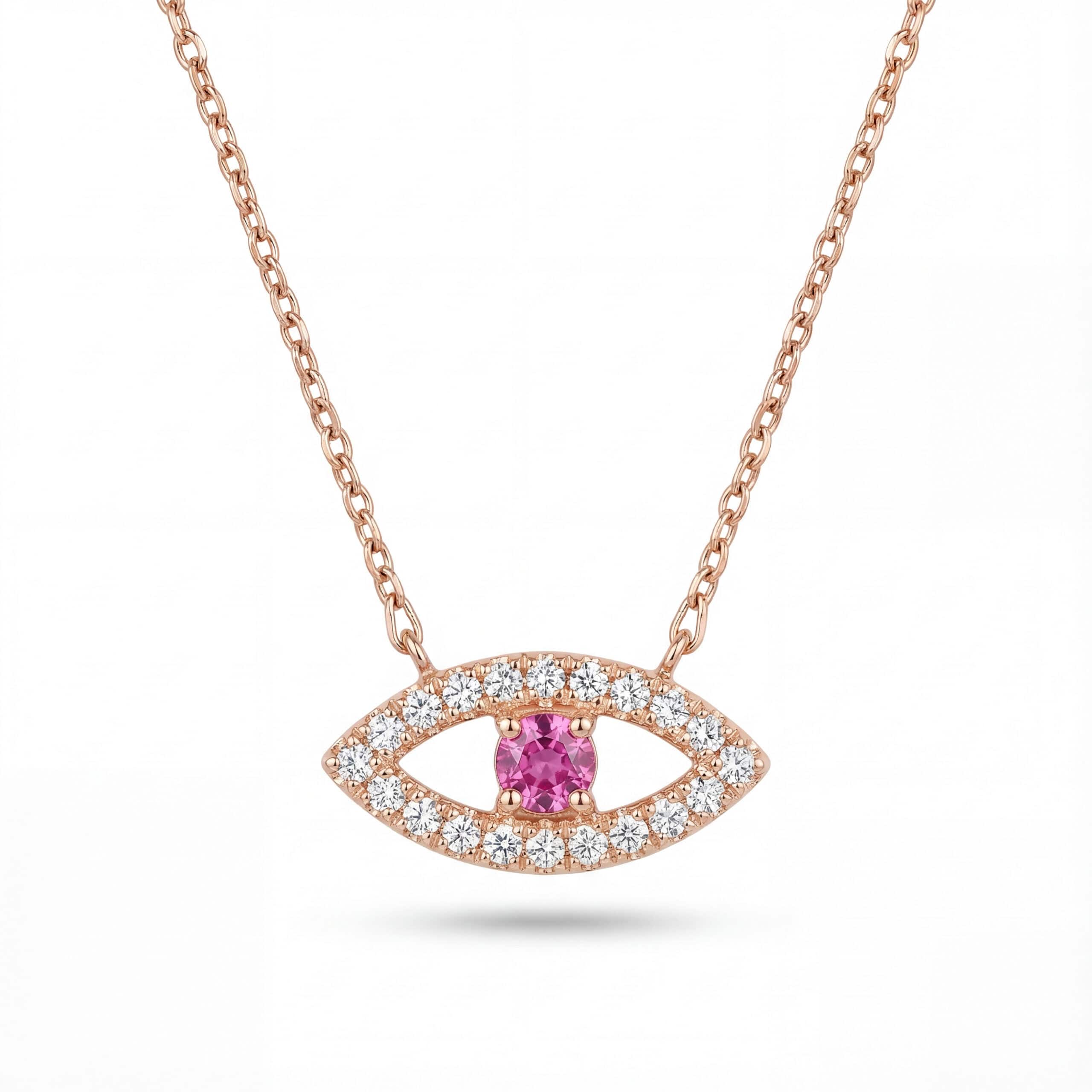 תליון עיין עם אבן חן ורודה ויהלומים – Ewelina , זהב לבן, צהוב או ורוד 14K משובץ יהלומים.